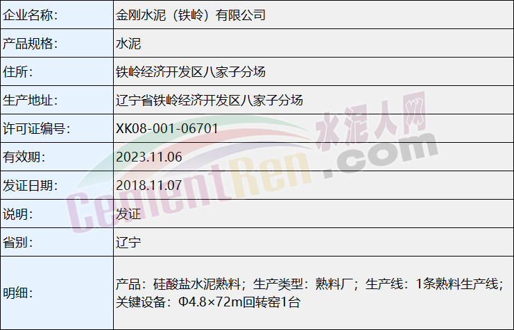 金剛水泥(鐵嶺)有限公司 生產(chǎn)許可證信息