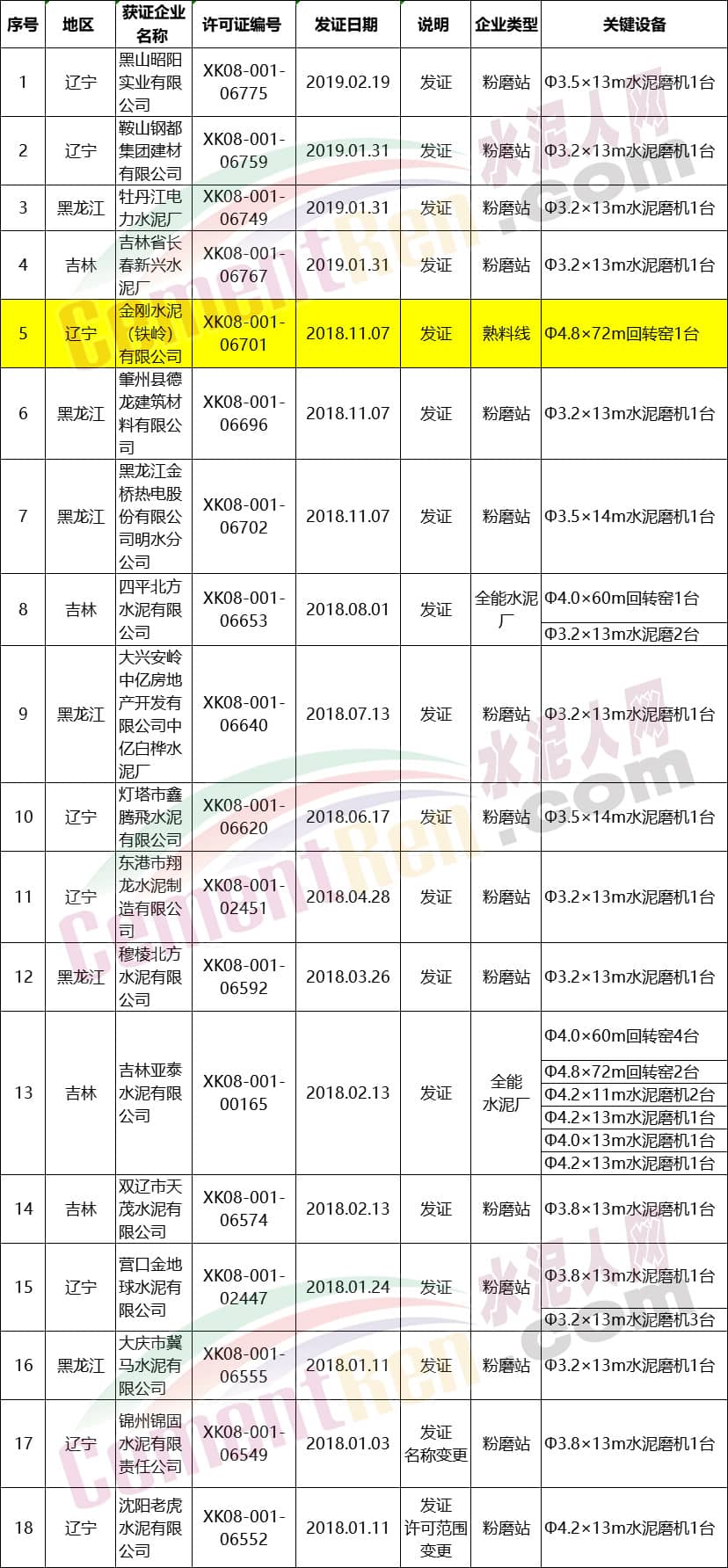 據(jù)查詢,遼寧,吉林,黑龍江從2018年1月至今一共新領(lǐng)生產(chǎn)許可證18個編號。其中除吉林亞泰水泥有限公司外和金剛水泥(鐵嶺)有限公司關(guān)鍵設(shè)備包含回轉(zhuǎn)窯設(shè)備,其余全部為水泥磨機。按照2018年1月1日起開始施行的《水泥玻璃行業(yè)產(chǎn)能置換實施辦法》計算金剛水泥(鐵嶺)有限公司Φ4.8×72m回轉(zhuǎn)窯設(shè)計產(chǎn)能為5000t/d熟料生產(chǎn)線。
