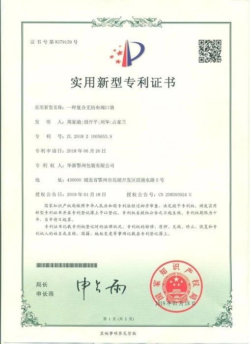 近日,華新包裝公司研制的“一種復(fù)合無紡布閥口袋”獲得了國家知識產(chǎn)權(quán)局頒發(fā)的實用新型專利證書,專利期限為10年,這是該公司獲得的第十項專利。