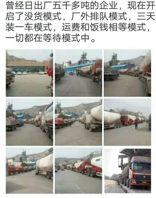 有當(dāng)?shù)厮嘟?jīng)銷商對(duì)當(dāng)下的行情調(diào)侃道:“曾經(jīng)日出廠5000多噸的水泥企業(yè),開啟了沒貨模式,廠外排隊(duì)模式,三天裝一車模式,運(yùn)費(fèi)和飯錢相等模式,一切都在等待模式中。”