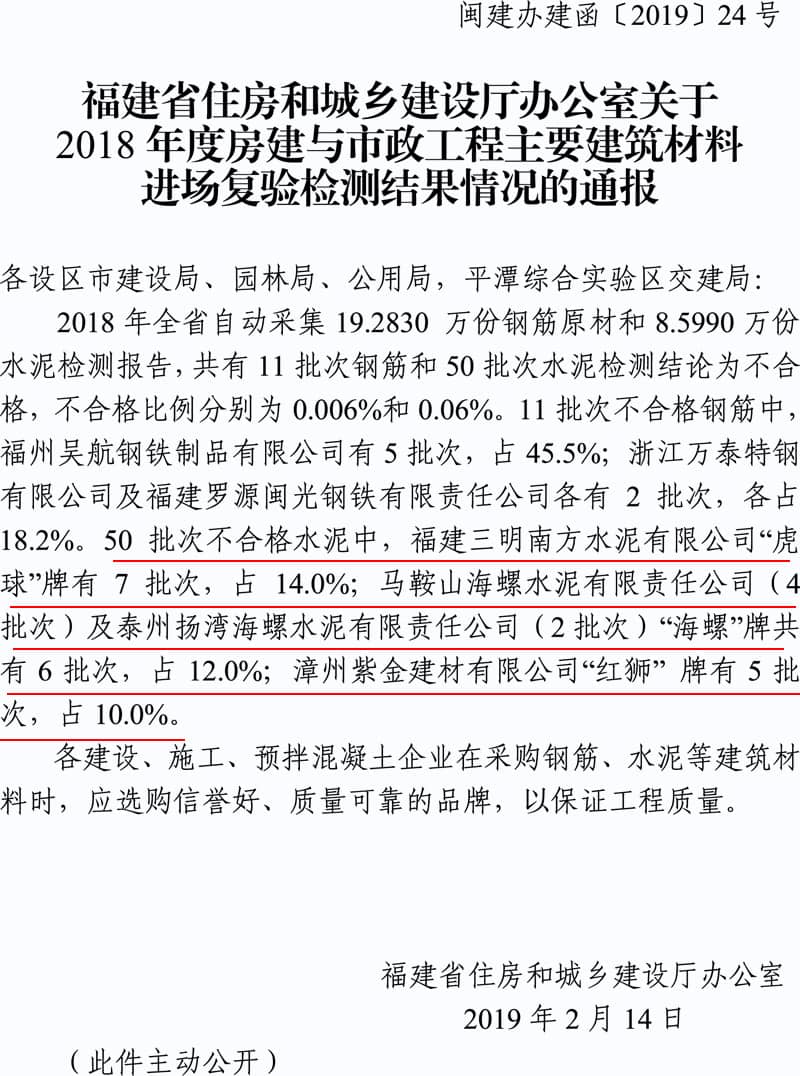 水泥人網(wǎng)消息近日,福建省住房和城鄉(xiāng)建設(shè)廳網(wǎng)站發(fā)布通報顯示,檢測發(fā)現(xiàn)50批次不合格水泥中,福建三明南方水泥有限公司“虎球”牌有7批次,占14.0%;馬鞍山海螺水泥有限責(zé)任公司(4批次)及泰州揚灣海螺水泥有限責(zé)任公司(2批次)“海螺”牌共有6批次,占12.0%;漳州紫金建材有限公司“紅獅” 牌有5批次,占10.0%。