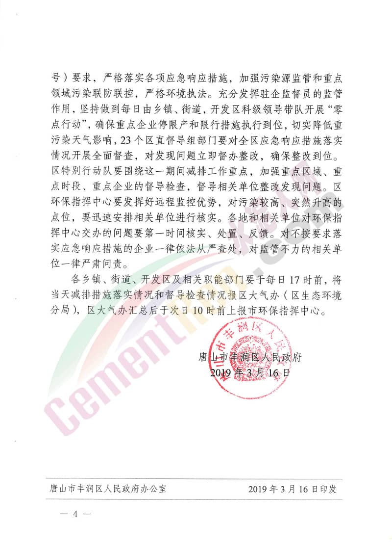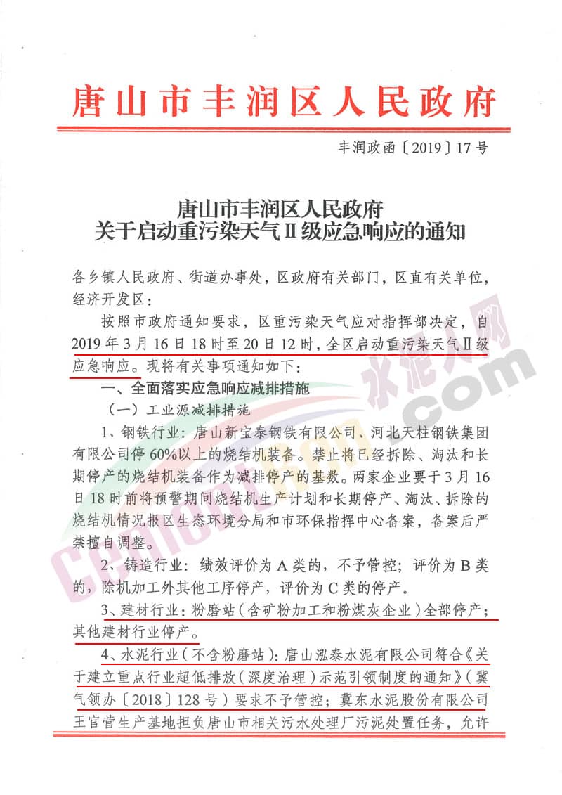 據(jù)水泥人網了解,同一日唐山市政府也發(fā)布了相關通知,通知稱:按照省大氣辦《關于啟動區(qū)域一和區(qū)域二Ⅱ級應急響應的通知》要求,根據(jù)近日氣象擴散條件,市重污染天氣應對指揮部決定自2019年3月16日18時至20日12時,全市啟動重污染天氣Ⅱ級應急響應。