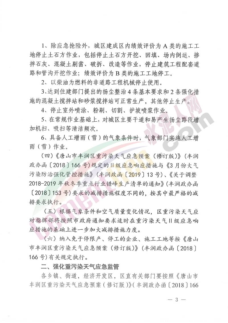 揚塵源控制措施。除應急搶險外,市、縣城市建成區(qū)內績效評價為A類的施工工地停止土石方作業(yè),包括停止土石方開挖、回填、場內倒運、摻拌石灰、混凝土別鑿、破拆、改造等作業(yè),停止建筑工程配套道路和管溝開挖作業(yè);績效評價為B類的施工工地停工。以柴油為燃料的非道路工程機械停止使用。達到住建部門提出的揚塵整治4條基本要求和2條強化措施的混凝土攪拌站和砂漿攪拌站可正常生產,其他停止生產。