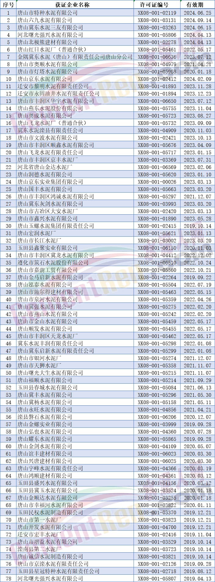 唐山市豐潤區(qū)水泥廠、熟料廠名單