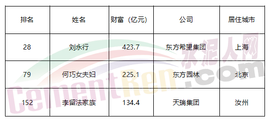 水泥行業(yè)天瑞水泥李留法家族入圍 ,排名第152位,財富134.4億元。