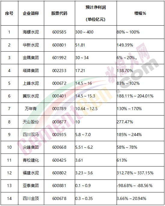 水泥人網(wǎng)同步發(fā)布水泥行業(yè)上市企業(yè)2018年利潤排行榜: