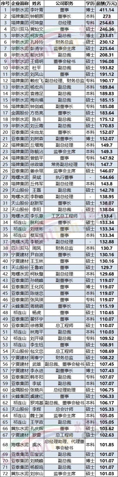 在水泥行業(yè)利潤大漲的同時,各上市公司高管薪資也有所提升。據(jù)不完全統(tǒng)計,上市企業(yè)百萬薪酬高管共七十二位。其中華新水泥李葉青以薪酬411.14萬元排名年薪過百萬上市公司高管第一名。塔牌集團(tuán)董事長鐘朝暉以薪酬273萬元排名第二位,塔牌總經(jīng)理何坤皇以254.63排名第三位。