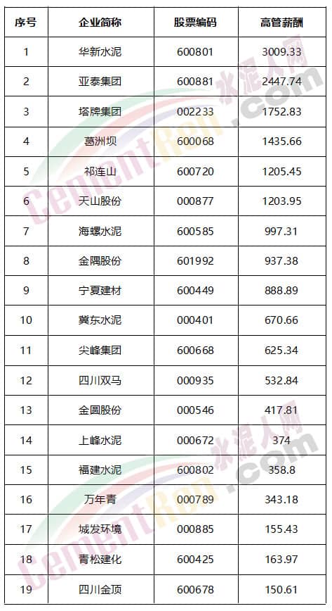 上市水泥企業(yè)高管薪酬合計排行榜