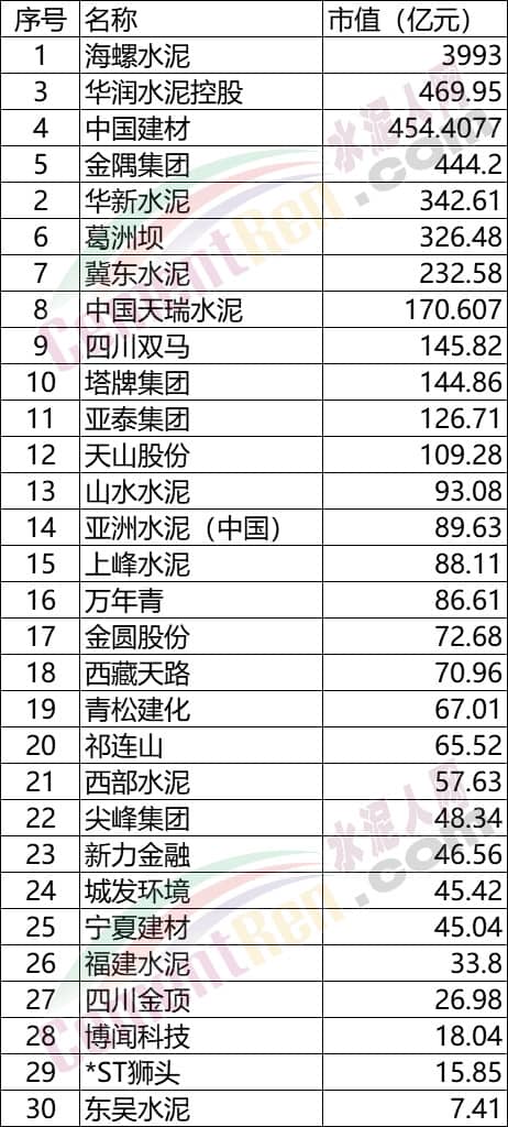 從上市公司市值排名來看,截止3月17日海螺水泥總市值近4000億元,華潤水泥控股、中國建材市值近500億元,海螺水泥成為水泥行業(yè)市值最大的上市企業(yè)。