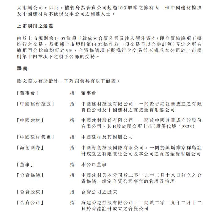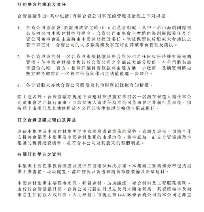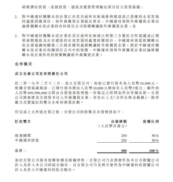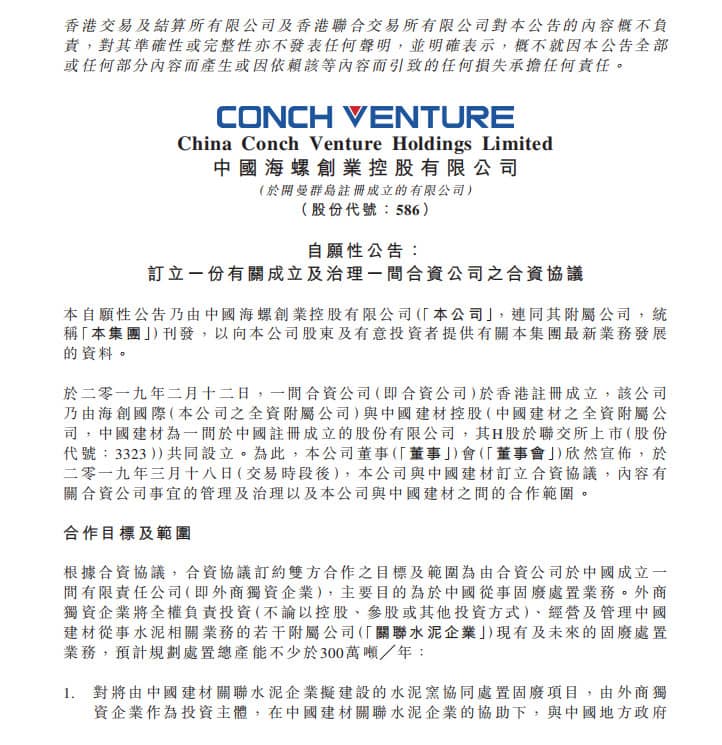 公告聲明,合資公司不僅將獨(dú)占中建材待開發(fā)的水泥窯資源,同時(shí)有權(quán)力獲得中建材已建項(xiàng)目的股權(quán),而對(duì)于與第三方合作的協(xié)同處置項(xiàng)目,合資公司也有權(quán)力繼承中建材股權(quán)并由中建材督促第三方將其股權(quán)轉(zhuǎn)讓給合資公司,由此未來合資公司將獨(dú)占中建材相關(guān)的的協(xié)同處置項(xiàng)目和待開發(fā)水泥窯資源?,F(xiàn)有及未來的固廢處置業(yè)務(wù)總產(chǎn)能將不少于300萬噸╱年。