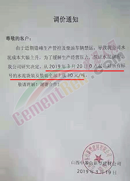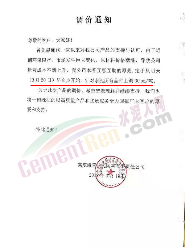 冀東海天水泥聞喜有限責(zé)任公司調(diào)價通知稱由于近期環(huán)保限產(chǎn),市場發(fā)生巨大變化,原材料價格猛漲,導(dǎo)致公司運營成本不斷上升。定于3月20日早8點開始針對水泥所有品種上調(diào)30元/噸。