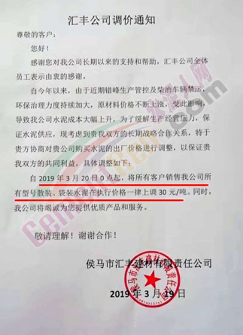 侯馬市匯豐建材有限責(zé)任公司調(diào)價通知稱自今年以來,由于近期錯峰生產(chǎn)管控及柴油車輛禁運,環(huán)保治理力度持續(xù)加大,原材料價格不斷上漲,受此影響導(dǎo)致公司水泥成本上升,為了緩解生產(chǎn)經(jīng)營壓力,保證水泥供應(yīng)。定于3月20日零點起上調(diào)所有型號散裝、袋裝水泥價格,上幅幅度為30元/噸。