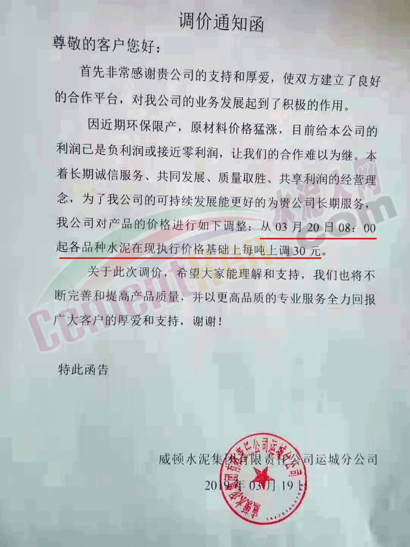 威頓水泥集團(tuán)有限責(zé)任公司運城分公司調(diào)價通知函稱,因近期環(huán)保限產(chǎn),原材料價格猛漲,目前公司利潤已是負(fù)利潤或接近零利潤。本著長期誠信服務(wù),共同發(fā)展,質(zhì)量取勝,共享利潤的經(jīng)營理念。同時,為了公司的可持續(xù)發(fā)展,為客戶更好的服務(wù),定于3月20日8時起各品種水泥在原執(zhí)行價格基礎(chǔ)上每噸上調(diào)30元。