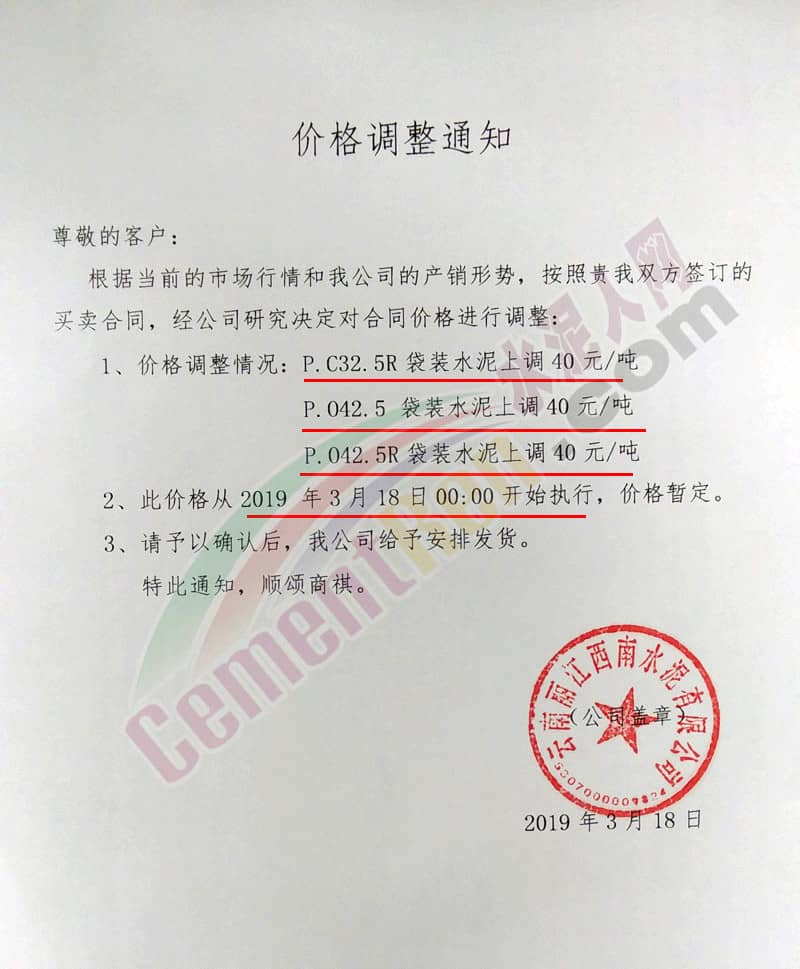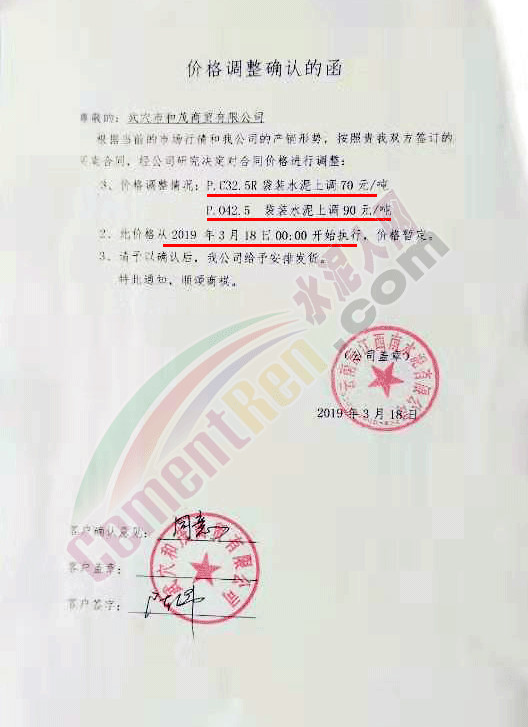 云南麗江西南水泥同期發(fā)給外圍經(jīng)銷商的價格調(diào)整確認(rèn)函稱,根據(jù)當(dāng)前的市場行情和公司的產(chǎn)銷形勢。經(jīng)公司研究決定從2019年3月18日00.00開始對合同價格進(jìn)行調(diào)整:其中P.C32.5R 袋裝水泥上調(diào)70元/噸。P.042.5 袋裝水泥上調(diào)90元/噸。