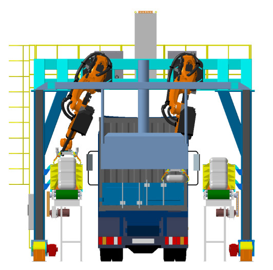袋裝水泥智能裝車系統(tǒng),通過伺服系統(tǒng)控制機(jī)器人抓手上下擺動(dòng)來進(jìn)行裝車碼垛,這樣可以省時(shí)省力。此過程完全自動(dòng)化,不需要人工輔助,是現(xiàn)代生產(chǎn)線裝車自動(dòng)化的理想設(shè)備。袋裝水泥智能裝車系統(tǒng)由桁架、工業(yè)機(jī)器人、控制系統(tǒng)、收塵系統(tǒng)等部分組成。裝載前,待裝載車輛進(jìn)入指定位置,通過桁架上的紅外激光掃描,確定車輛的大小及停放位置,桁架通過軌道移動(dòng)到車輛貨箱前端裝包區(qū)域。
