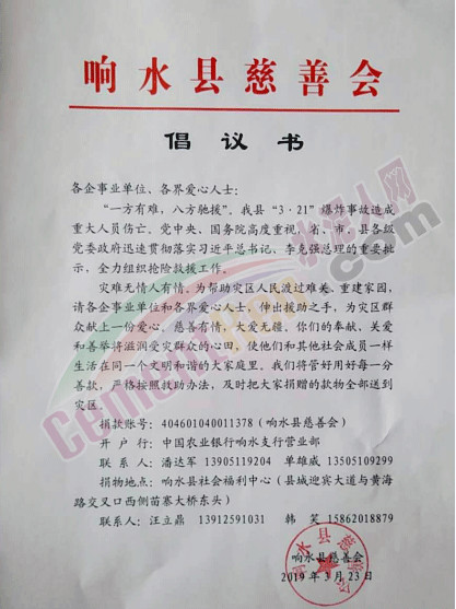 記者致電這份《倡議書》上的聯(lián)系人,對(duì)方表示,該倡議書確為慈善會(huì)所發(fā),用于接受愛心款物,幫助“3·21響水爆炸事件”中受災(zāi)群眾獻(xiàn)上愛心,渡過難關(guān)。該倡議書留下的募款卡號(hào)即為響水縣慈善會(huì)接受善款的對(duì)公賬號(hào),捐款時(shí)可以寫明指定用于“3·.21響水爆炸事件”。