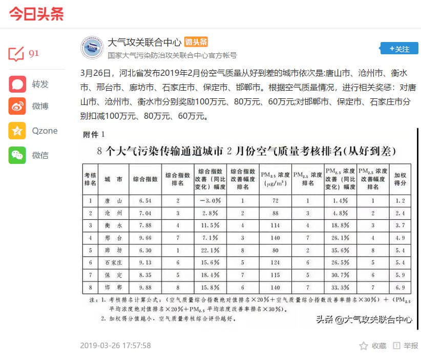 日前,國家大氣污染防治攻關(guān)聯(lián)合中心公布:3月26日,河北省發(fā)布2019年2月份空氣質(zhì)量從好到差的城市依次是:唐山市、滄州市、衡水市、邢臺市、廊坊市、石家莊市、保定市、邯鄲市。根據(jù)空氣質(zhì)量情況,進(jìn)行相關(guān)獎懲:對唐山市、滄州市、衡水市分別獎勵100萬元、80萬元、60萬元;對邯鄲市、保定市、石家莊市分別扣減100萬元、80萬元、60萬元。