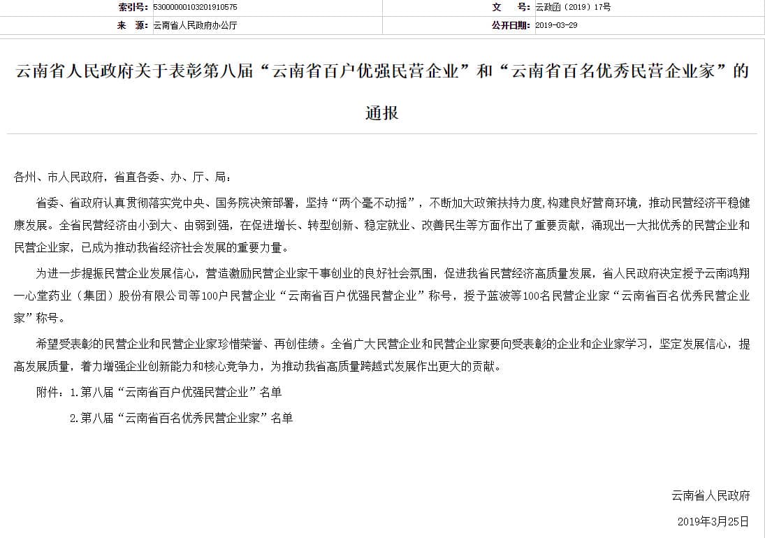 日前云南省人民政府發(fā)布《關(guān)于表彰第八屆“云南省百戶優(yōu)強(qiáng)民營(yíng)企業(yè)”和“云南省百名優(yōu)秀民營(yíng)企業(yè)家”的通報(bào)》稱為進(jìn)一步提振民營(yíng)企業(yè)發(fā)展信心,營(yíng)造激勵(lì)民營(yíng)企業(yè)家干事創(chuàng)業(yè)的良好社會(huì)氛圍,促進(jìn)云南省民營(yíng)經(jīng)濟(jì)高質(zhì)量發(fā)展,省人民政府決定授予云南鴻翔一心堂藥業(yè)(集團(tuán))股份有限公司等100戶民營(yíng)企業(yè)“云南省百戶優(yōu)強(qiáng)民營(yíng)企業(yè)”稱號(hào),授予藍(lán)波等100名民營(yíng)企業(yè)家“云南省百名優(yōu)秀民營(yíng)企業(yè)家”稱號(hào)。