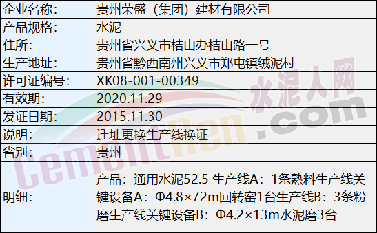 據(jù)水泥人網(wǎng)了解,上文所提到的興義市馬嶺鎮(zhèn)榮盛水泥廠為貴州榮成(集團(tuán) )建材有限公司(生產(chǎn)許可證編號(hào):XK08-001-00349)。質(zhì)檢總局生產(chǎn)許可證辦公室數(shù)據(jù)顯示企業(yè)生產(chǎn)地址位于貴州省黔西南州興義市鄭屯鎮(zhèn)絨泥村。企業(yè)擁有1條熟料生產(chǎn)線,關(guān)鍵設(shè)備為Φ4.8×72m回轉(zhuǎn)窯1臺(tái);3條粉磨生產(chǎn)線關(guān)鍵設(shè)備為Φ4.2×13m水泥磨3臺(tái)。