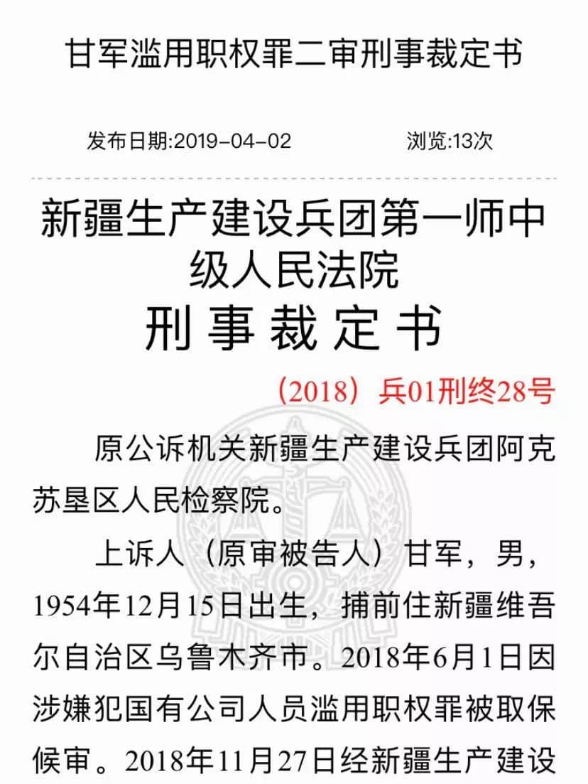 2018年12月,新疆生產(chǎn)建設(shè)兵團第一師中級人民法院駁回了甘軍的上訴,維持原判。