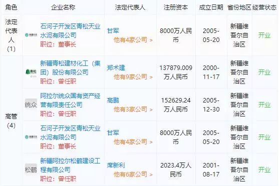公開資料顯示,甘軍于1954年12月出生,本科學(xué)歷,高級政工師,曾任新疆阿克蘇青松建材化工總廠磷礦政治指導(dǎo)員、團委副書記、水泥廠黨委書記、水泥廠第一副廠長、建化總廠黨委書記,2000年10月起任青松建化董事長、黨委書記。