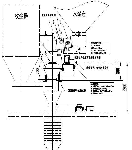 A 在現(xiàn)有的散裝水泥出庫斜槽上增設(shè)電動流量調(diào)節(jié)閥,放灰下料管位置安裝科里奧利粉體秤,安裝高度約0.73m,并接入壓縮空氣管道用于軸承密封。