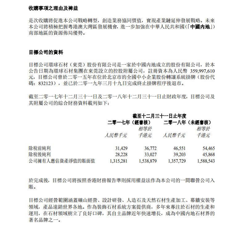 據(jù)悉,目標(biāo)公司環(huán)球石材(東莞)股份有限公司是一家于中國內(nèi)地成立的股份有限公司,于公告日期為環(huán)球石材集團(tuán)在東莞設(shè)立的控股附屬公司,注冊(cè)資為人民幣3.6億元,目標(biāo)公司曾于2015年在位于北京市的全國中小企業(yè)股份轉(zhuǎn)讓系統(tǒng)掛牌,并已于2019年3月19日完成終止掛牌程序后退市。