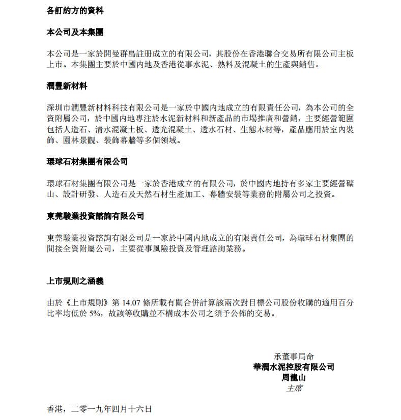 華潤水泥控股公告,該公司的全資附屬公司深圳市潤豐新材料科技有限公司與環(huán)球石材集團(tuán)有限公司及東莞駿業(yè)投資諮詢有限公司訂立協(xié)議,據(jù)此,潤豐新材料收購環(huán)球石材(東莞)股份有限公司(目標(biāo)公司)的20.0061%股份,代價(jià)為人民幣3.88億元。