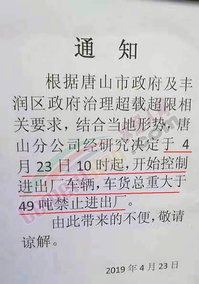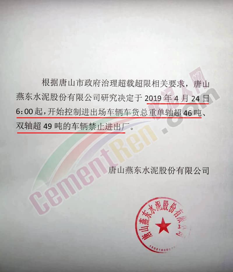 冀東水泥發(fā)通知稱:根據(jù)唐山市政府及豐潤區(qū)政府治理超限相關(guān)要求,結(jié)合當(dāng)?shù)匦蝿?,唐山分公司研究決定于4月23日10時起,開始控制進出廠車輛,車貨總重大于49噸禁止進出廠。