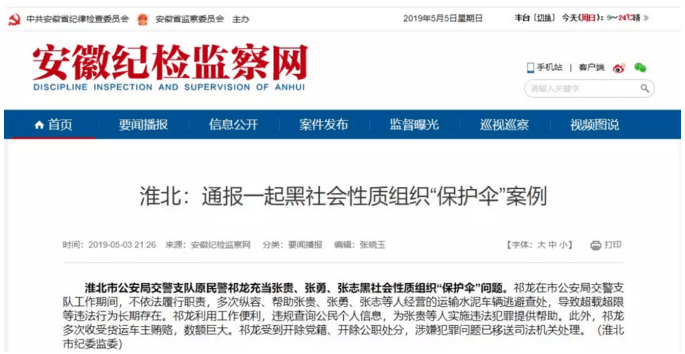 日前,安徽紀(jì)檢監(jiān)察網(wǎng)通報(bào)一起黑社會(huì)性質(zhì)組織“保護(hù)傘”案例稱:淮北市公安局交警支隊(duì)原民警祁龍充當(dāng)張貴、張勇、張志黑社會(huì)性質(zhì)組織“保護(hù)傘”問題。