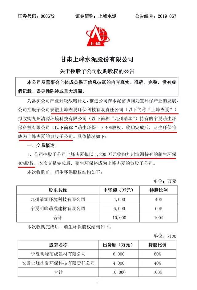 為落實公司產(chǎn)業(yè)升級戰(zhàn)略計劃,推進(jìn)公司在水泥窯協(xié)同處置環(huán)保產(chǎn)業(yè)的發(fā)展,公司控股子公司安徽上峰杰夏環(huán)??萍加邢挢?zé)任公司(以下簡稱“上峰杰夏”)擬以1800萬股收購九州清源環(huán)境科技有限公司(以下簡稱“九州清源”)持有的寧夏萌生環(huán)??萍加邢薰?以下簡稱“萌生環(huán)保”)40%股權(quán),收購?fù)瓿珊?,萌生環(huán)保將成為上峰杰夏的參股子公司。