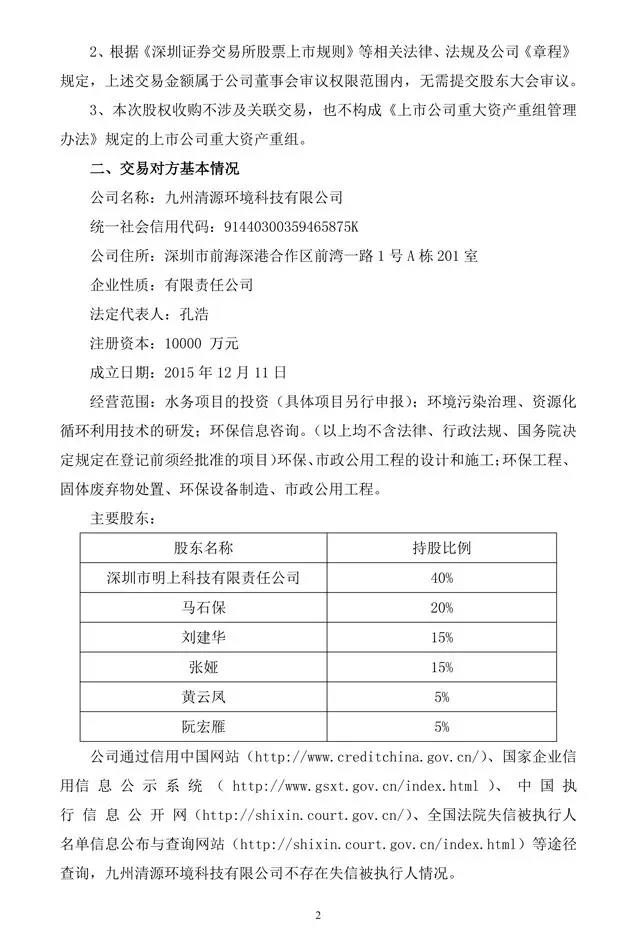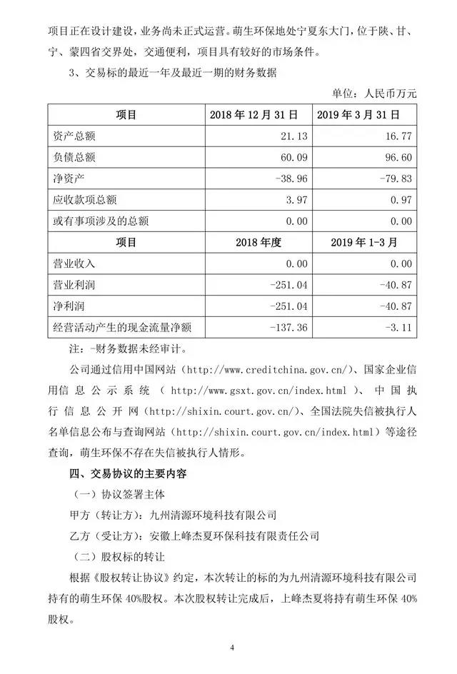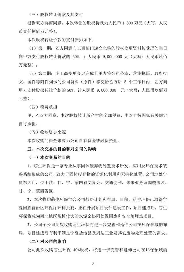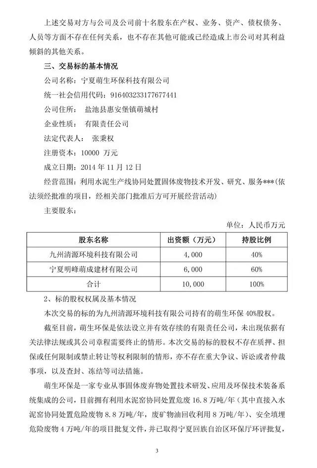 萌生環(huán)保是一家專業(yè)從事固體廢棄物處置技術(shù)研發(fā)、應(yīng)用及環(huán)保技術(shù)裝備系統(tǒng)集成的公司,致力于固體廢棄物的資源化利用和無害化處置,公司地處寧夏東大門,位于陜、甘、寧、蒙四省交界處,交通便利,未來業(yè)務(wù)范圍覆蓋陜、甘、寧、蒙四省區(qū)。本次收購萌生環(huán)保符合公司戰(zhàn)略計劃和布局,目前,萌生環(huán)保已取得寧夏回族自治區(qū)環(huán)保廳環(huán)評批復(fù),正在開展項目設(shè)計建設(shè)工作,項目建成后,萌生環(huán)保將成為西北地區(qū)規(guī)模較大的水泥窯協(xié)同處置固廢和安全填埋場項目。公告原文如下: