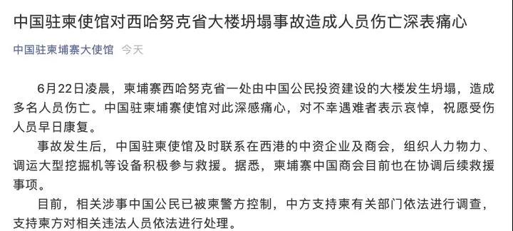 下面是中國駐柬埔寨大使館官方微信公眾號(hào)的發(fā)文:中國駐柬使館對(duì)西哈努克省大樓坍塌事故造成人員傷亡深表痛心。