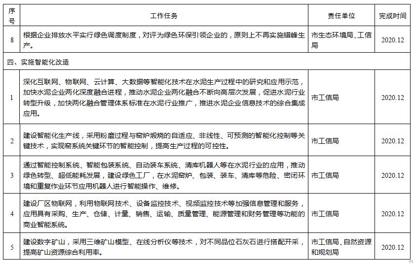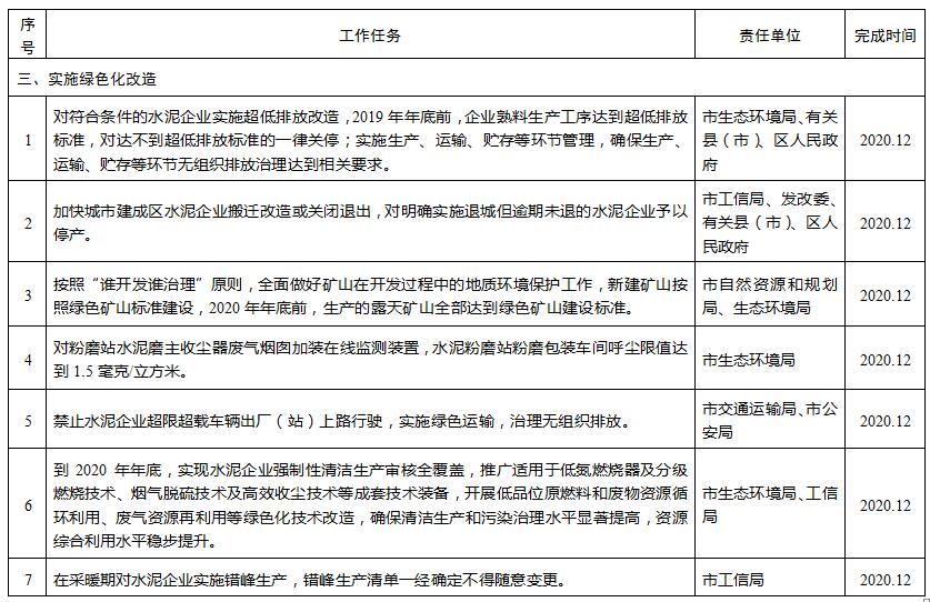 (二)實(shí)施綠色化改造。對(duì)符合條件的水泥企業(yè)實(shí)施超低排放改造,2019年年底前,企業(yè)熟料生產(chǎn)工序達(dá)到超低排放標(biāo)準(zhǔn),對(duì)達(dá)不到超低排放標(biāo)準(zhǔn)的一律關(guān)停;實(shí)施生產(chǎn)、運(yùn)輸、貯存等環(huán)節(jié)管理,確保生產(chǎn)、運(yùn)輸、貯存等環(huán)節(jié)無組織排放治理達(dá)到相關(guān)要求。加快城市建成區(qū)水泥企業(yè)搬遷改造或關(guān)閉退出,對(duì)明確實(shí)施退城但逾期未退的水泥企業(yè)予以停產(chǎn)。按照“誰開發(fā)誰治理”原則,全面做好礦山在開發(fā)過程中的地質(zhì)環(huán)境保護(hù)工作,新建礦山按照綠色礦山標(biāo)準(zhǔn)建設(shè),2020年年底前,生產(chǎn)的露天礦山全部達(dá)到綠色礦山建設(shè)標(biāo)準(zhǔn)。對(duì)粉磨站水泥磨主收塵器廢氣煙囪加裝在線監(jiān)測(cè)裝置,水泥粉磨站粉磨包裝車間呼塵限值達(dá)到1.5毫克/立方米。禁止水泥企業(yè)超限超載車輛出廠(站)上路行駛,實(shí)施綠色運(yùn)輸,治理無組織排放。到2020年年底,實(shí)現(xiàn)水泥企業(yè)強(qiáng)制性清潔生產(chǎn)審核全覆蓋,推廣適用于低氮燃燒器及分級(jí)燃燒技術(shù)、煙氣脫硫技術(shù)及高效收塵技術(shù)等成套技術(shù)裝備,開展低品位原燃料和廢物資源循環(huán)利用、廢氣資源再利用等綠色化技術(shù)改造,確保清潔生產(chǎn)和污染治理水平顯著提高,資源綜合利用水平穩(wěn)步提升。在采暖期對(duì)水泥企業(yè)實(shí)施錯(cuò)峰生產(chǎn),錯(cuò)峰生產(chǎn)清單一經(jīng)確定不得隨意變更。根據(jù)企業(yè)排放水平實(shí)行綠色調(diào)度制度,對(duì)評(píng)為綠色環(huán)保引領(lǐng)企業(yè)的,原則上不再實(shí)施錯(cuò)峰生產(chǎn)。