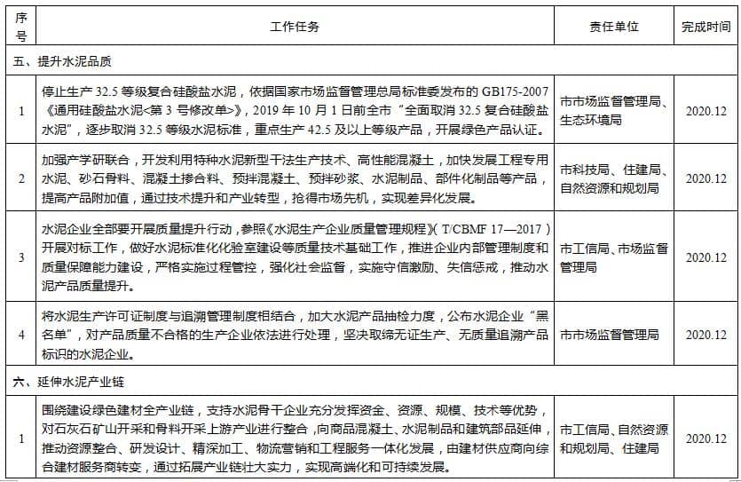 (四)提升水泥品質(zhì)。停止生產(chǎn)32.5等級(jí)復(fù)合硅酸鹽水泥,依據(jù)國(guó)家市場(chǎng)監(jiān)督管理總局標(biāo)準(zhǔn)委發(fā)布的GB175-2007《通用硅酸鹽水泥〈第3號(hào)修改單〉》,2019年10月1日前全市“全面取消32.5復(fù)合硅酸鹽水泥”,逐步取消32.5等級(jí)水泥標(biāo)準(zhǔn),重點(diǎn)生產(chǎn)42.5及以上等級(jí)產(chǎn)品,開展綠色產(chǎn)品認(rèn)證。加強(qiáng)產(chǎn)學(xué)研聯(lián)合,開發(fā)利用特種水泥新型干法生產(chǎn)技術(shù)、高性能混凝土,加快發(fā)展工程專用水泥、砂石骨料、混凝土摻合料、預(yù)拌混凝土、預(yù)拌砂漿、水泥制品、部件化制品等產(chǎn)品,提高產(chǎn)品附加值,通過技術(shù)提升和產(chǎn)業(yè)轉(zhuǎn)型,搶得市場(chǎng)先機(jī),實(shí)現(xiàn)差異化發(fā)展。水泥企業(yè)全部要開展質(zhì)量提升行動(dòng),參照《水泥生產(chǎn)企業(yè)質(zhì)量管理規(guī)程》(T/CBMF17—2017)開展對(duì)標(biāo)工作,做好水泥標(biāo)準(zhǔn)化化驗(yàn)室建設(shè)等質(zhì)量技術(shù)基礎(chǔ)工作,推進(jìn)企業(yè)內(nèi)部管理制度和質(zhì)量保障能力建設(shè),嚴(yán)格實(shí)施過程管控,強(qiáng)化社會(huì)監(jiān)督,實(shí)施守信激勵(lì)、失信懲戒,推動(dòng)水泥產(chǎn)品質(zhì)量提升。將水泥生產(chǎn)許可證制度與追溯管理制度相結(jié)合,加大水泥產(chǎn)品抽檢力度,公布水泥企業(yè)“黑名單”,對(duì)產(chǎn)品質(zhì)量不合格的生產(chǎn)企業(yè)依法進(jìn)行處理,堅(jiān)決取締無證生產(chǎn)、無質(zhì)量追溯產(chǎn)品標(biāo)識(shí)的水泥企業(yè)。