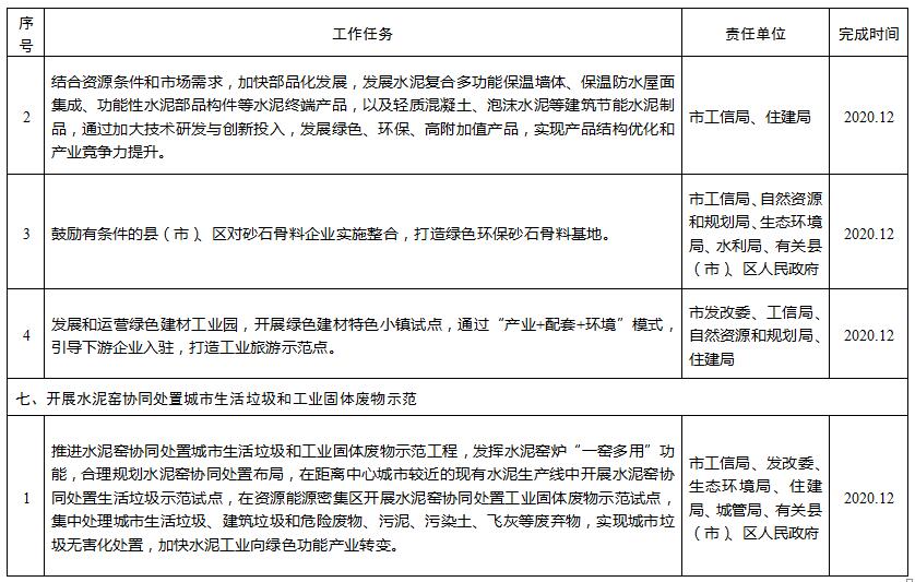 (五)延伸水泥產(chǎn)業(yè)鏈。圍繞建設(shè)綠色建材全產(chǎn)業(yè)鏈,支持水泥骨干企業(yè)充分發(fā)揮資金、資源、規(guī)模、技術(shù)等優(yōu)勢(shì),對(duì)石灰石礦山開采和骨料開采上游產(chǎn)業(yè)進(jìn)行整合,向商品混凝土、水泥制品和建筑部品延伸,推動(dòng)資源整合、研發(fā)設(shè)計(jì)、精深加工、物流營(yíng)銷和工程服務(wù)一體化發(fā)展,由建材供應(yīng)商向綜合建材服務(wù)商轉(zhuǎn)變,通過拓展產(chǎn)業(yè)鏈壯大實(shí)力,實(shí)現(xiàn)高端化和可持續(xù)發(fā)展。結(jié)合資源條件和市場(chǎng)需求,加快部品化發(fā)展,發(fā)展水泥復(fù)合多功能保溫墻體、保溫防水屋面集成、功能性水泥部品構(gòu)件等水泥終端產(chǎn)品,以及輕質(zhì)混凝土、泡沫水泥等建筑節(jié)能水泥制品,通過加大技術(shù)研發(fā)與創(chuàng)新投入,發(fā)展綠色、環(huán)保、高附加值產(chǎn)品,實(shí)現(xiàn)產(chǎn)品結(jié)構(gòu)優(yōu)化和產(chǎn)業(yè)競(jìng)爭(zhēng)力提升。鼓勵(lì)有條件的縣(市)、區(qū)對(duì)砂石骨料企業(yè)實(shí)施整合,打造綠色環(huán)保砂石骨料基地。發(fā)展和運(yùn)營(yíng)綠色建材工業(yè)園,開展綠色建材特色小鎮(zhèn)試點(diǎn),通過“產(chǎn)業(yè)+配套+環(huán)境”模式,引導(dǎo)下游企業(yè)入駐,打造工業(yè)旅游示范點(diǎn)。