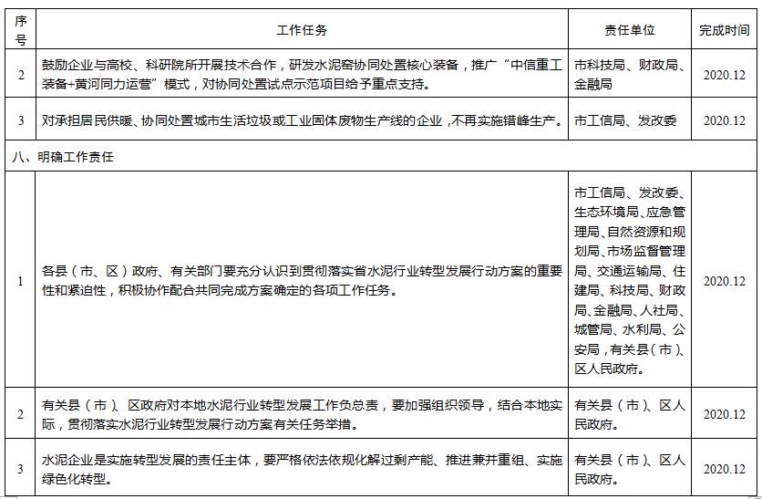(一)明確工作責(zé)任。各縣(市、區(qū))政府、有關(guān)部門要充分認(rèn)識(shí)到貫徹落實(shí)省水泥行業(yè)轉(zhuǎn)型發(fā)展行動(dòng)方案的重要性和緊迫性,積極協(xié)作配合共同完成方案確定的各項(xiàng)工作任務(wù)。各縣(市)、區(qū)政府對(duì)本地水泥行業(yè)轉(zhuǎn)型發(fā)展工作負(fù)總責(zé),加強(qiáng)組織領(lǐng)導(dǎo),結(jié)合本地實(shí)際,貫徹落實(shí)水泥行業(yè)轉(zhuǎn)型發(fā)展行動(dòng)方案有關(guān)任務(wù)舉措。水泥企業(yè)是實(shí)施轉(zhuǎn)型發(fā)展的責(zé)任主體,要嚴(yán)格依法依規(guī)化解過剩產(chǎn)能、推進(jìn)兼并重組、實(shí)施綠色化轉(zhuǎn)型。市工業(yè)和信息化局、發(fā)展和改革委員會(huì)、生態(tài)環(huán)境局、市場(chǎng)監(jiān)督管理局、自然資源和規(guī)劃局等部門要根據(jù)職責(zé)分工,加強(qiáng)指導(dǎo),完善相關(guān)政策措施。