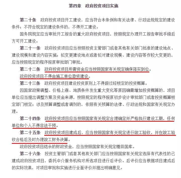 1、禁止“墊資施工”:政府投資項目不得由施工單位墊資建設(shè)。