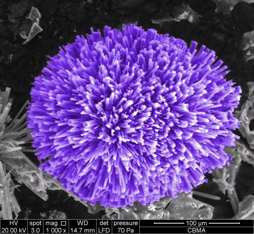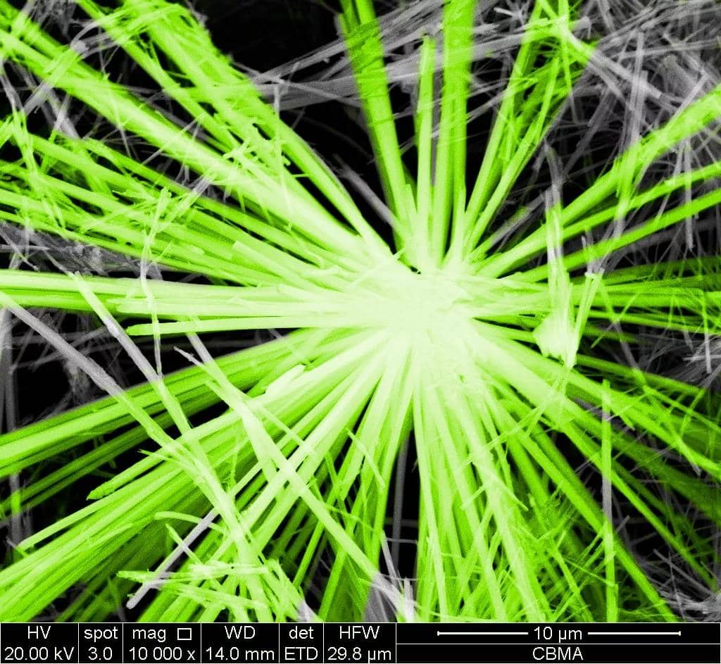 鈣礬石的掃描電鏡圖片。在低水灰比的混凝土中水化形成的鈣礬石微觀形貌呈松針狀聚集。