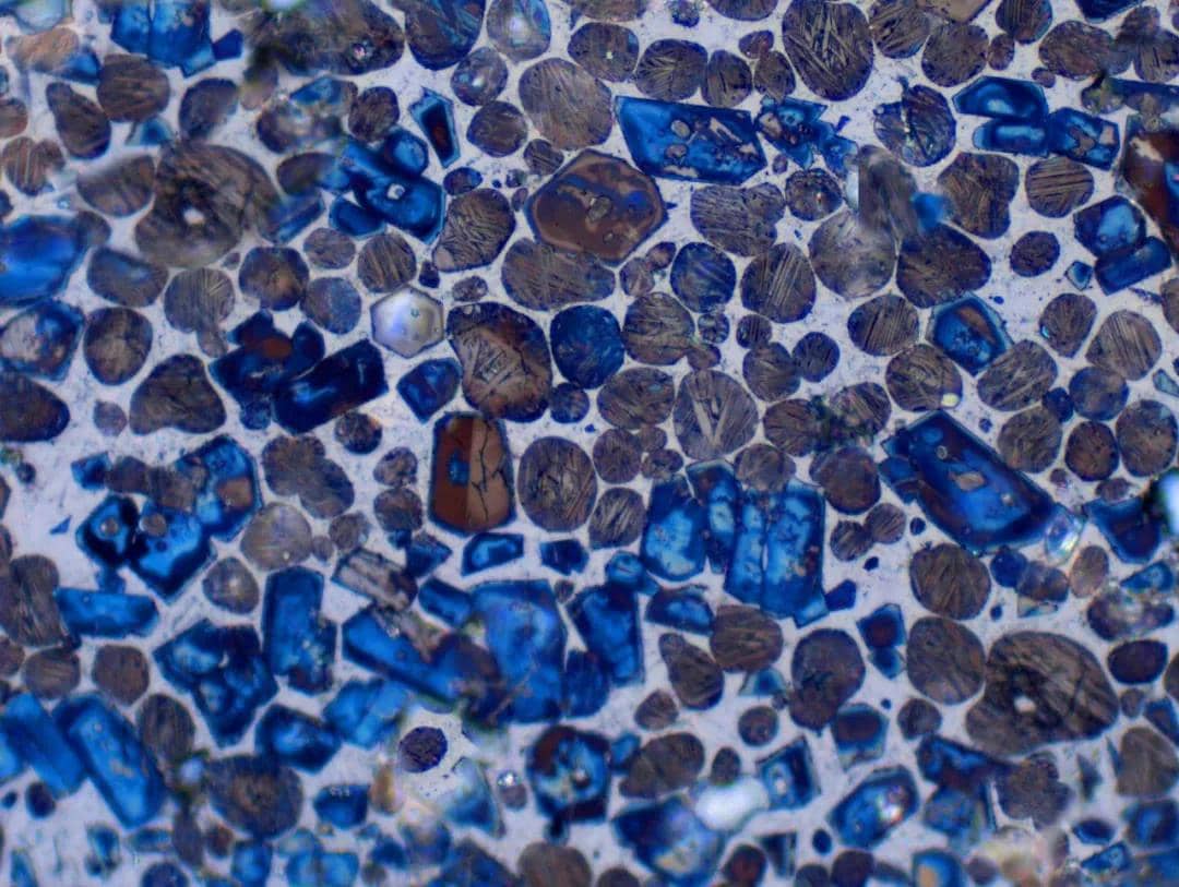 低熱硅酸鹽水泥熟料的金相顯微鏡照片,可以看到硅酸二鈣礦物呈橢圓形,有明顯交叉雙晶紋,猶如晶瑩透亮的寶石。