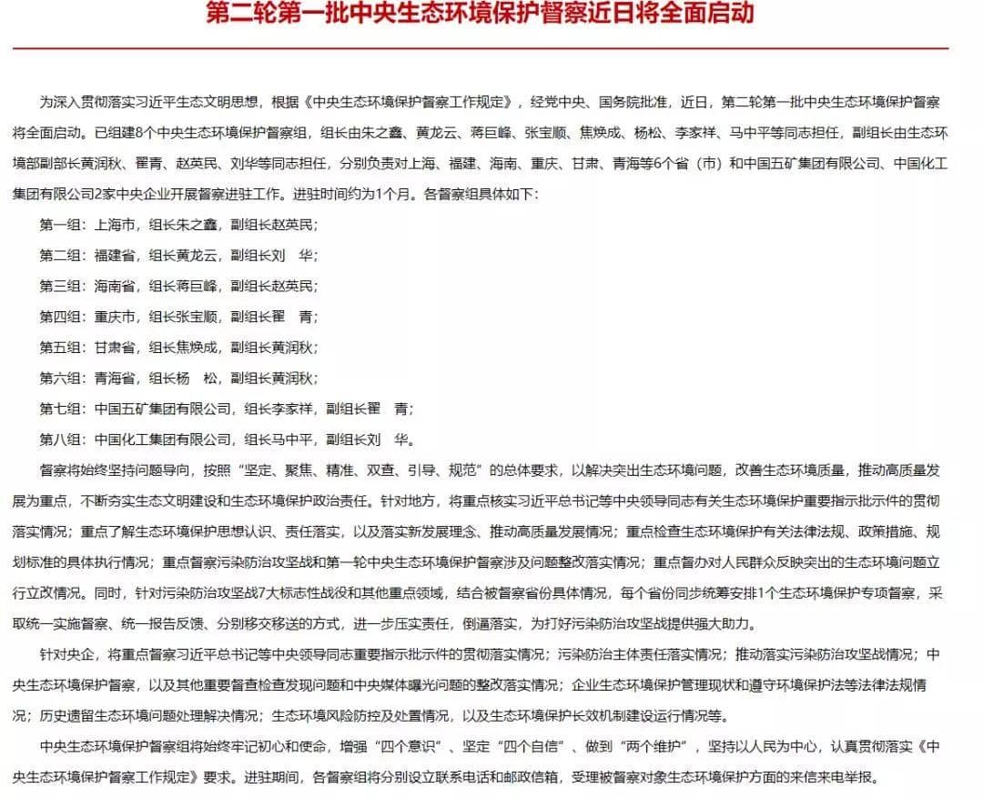據(jù)水泥人網(wǎng)了解,第二輪第一批中央環(huán)保督察確定的督察對(duì)象,除了上海、重慶等6省份,中國五礦、中國化工赫然在列。小編注意到,將央企列為督察對(duì)象是本輪督察亮點(diǎn)之一,之所以將上述兩家放到首批,原因之一便是它們此前已被中央督察組點(diǎn)名。