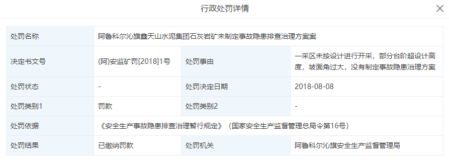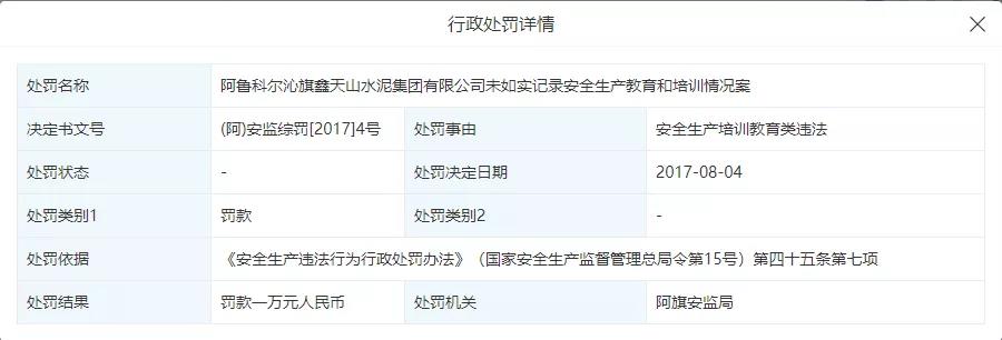 2017年8月4日,阿旗安監(jiān)局曾針對企業(yè)未如實記錄安全生產(chǎn)教育和培訓(xùn)情況做出行政罰,罰款一萬元人民幣。