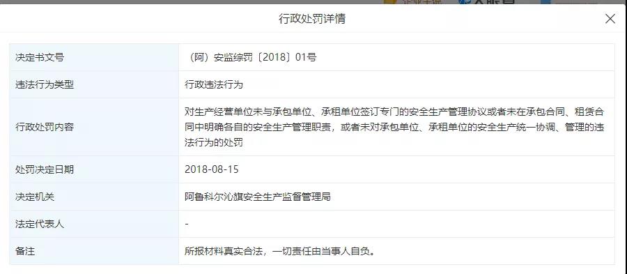 2018年 8月15日,阿魯科爾沁旗安全生產(chǎn)監(jiān)督管理局對企業(yè)行政違法行為實施行政處罰,處罰內(nèi)容為對生產(chǎn)經(jīng)營單位未與承包單位 、承租單位 簽訂專門的安全生產(chǎn)管理協(xié)議或未在承包合同、租賃合同中明確各自的安全生產(chǎn)管理職責(zé),或者未對承包單位 、承租單位 的安全生產(chǎn)統(tǒng)一協(xié)調(diào)、違法行為的處罰。