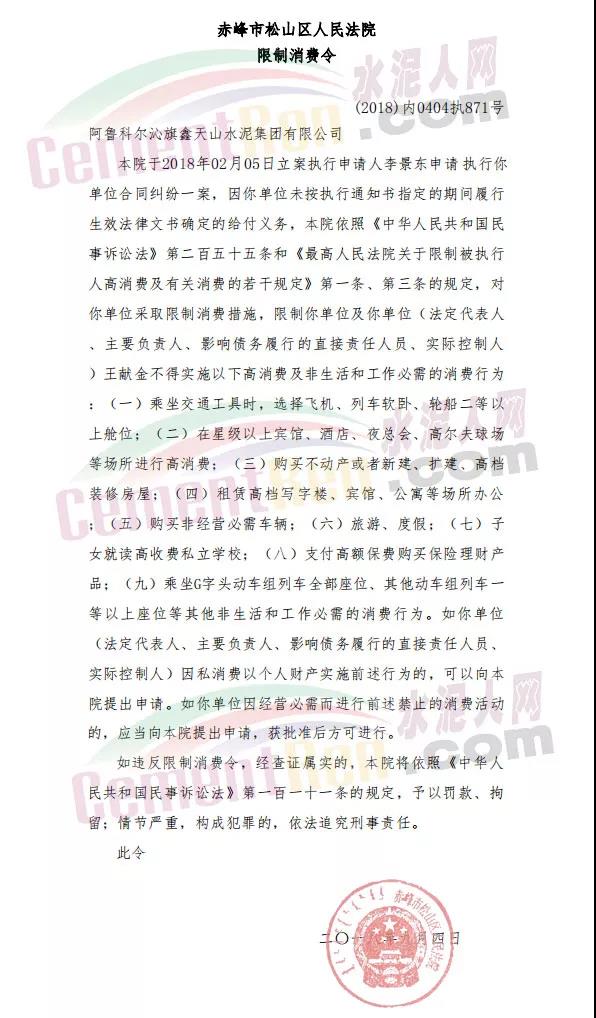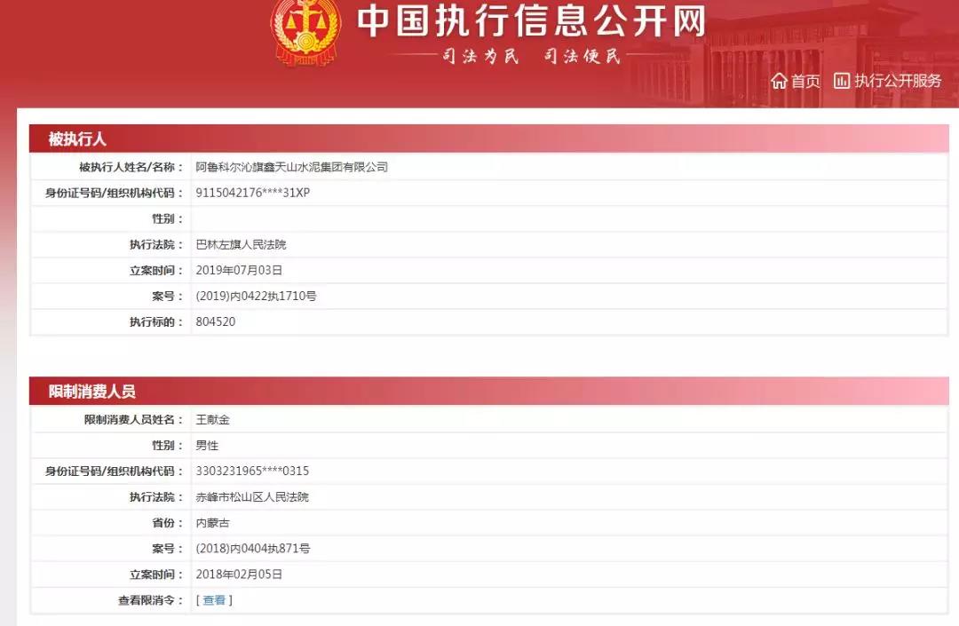 中國執(zhí)行信息公開網(wǎng)信息顯示,被執(zhí)行人為阿魯科爾沁旗鑫天山水泥集團(tuán)有限公司,被限制消費人員為王獻(xiàn)金。