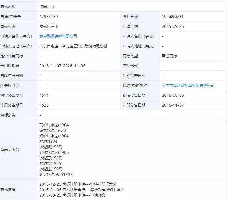 棗莊鵬源建材有限公司海固中聯(lián)注冊商標(biāo)
