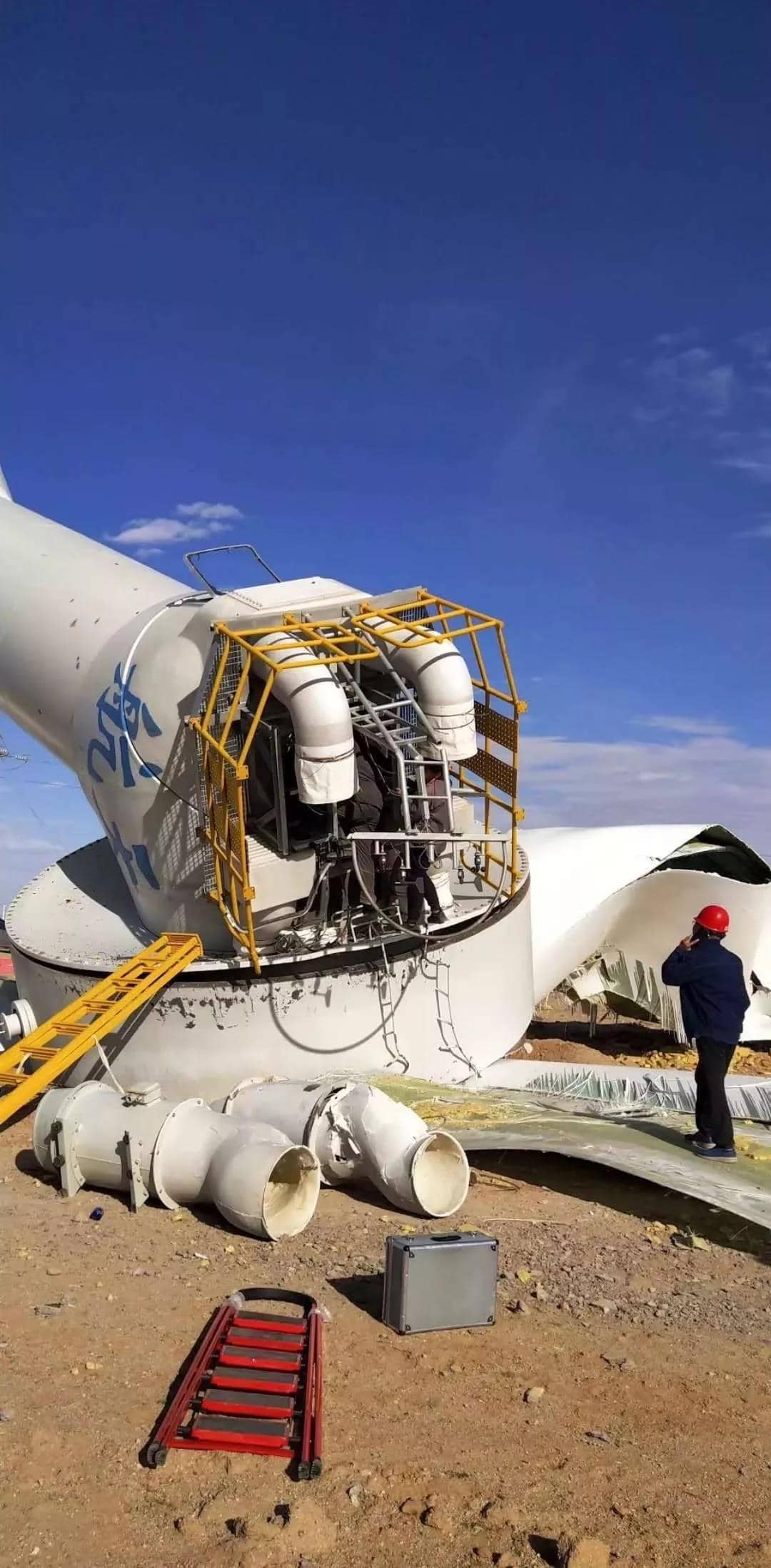 定檢維護人員嚴重違規(guī),在三只槳葉均處于全開狀態(tài)時,操作不當,對機組進行復位操作,剎車松閘,引起葉輪轉(zhuǎn)動,轉(zhuǎn)速持續(xù)上升,超速保護未起效,風機飛車,槳葉掃塔,結(jié)構(gòu)失穩(wěn),引起倒塔。