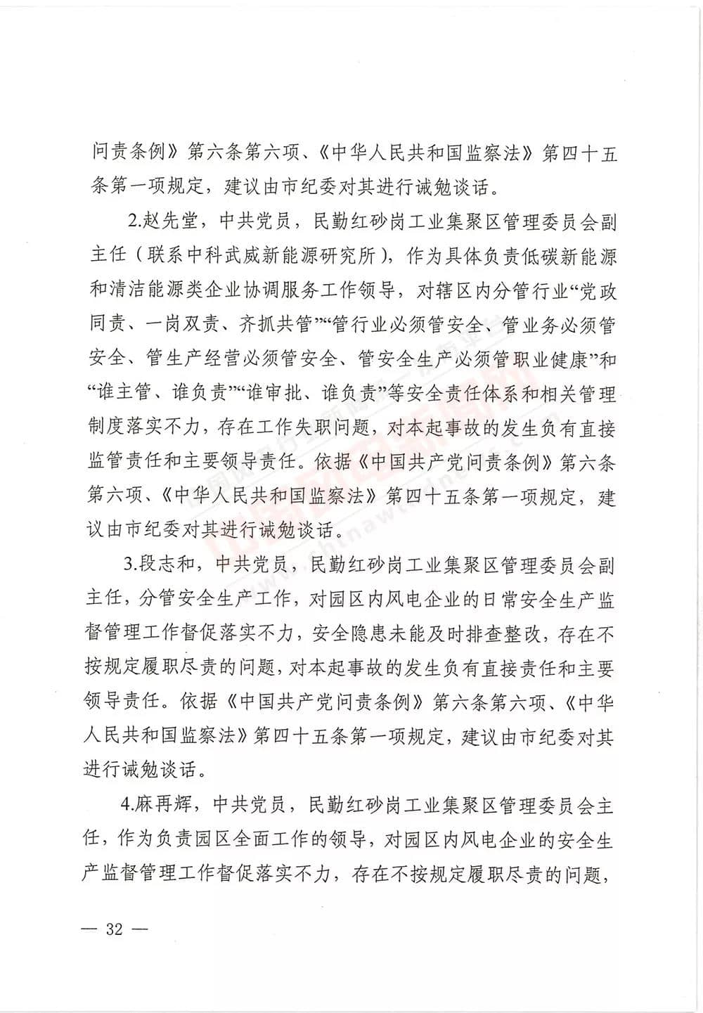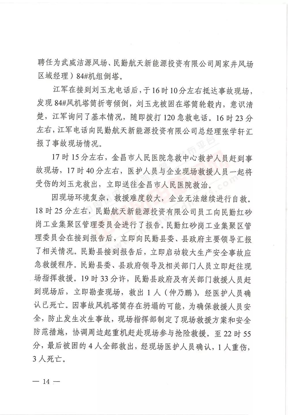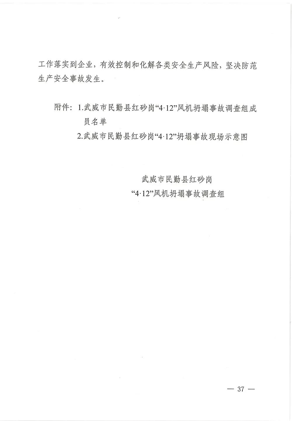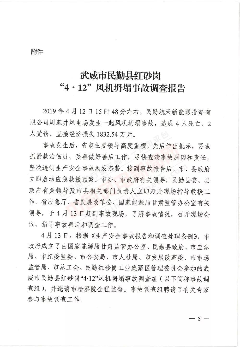 6月13日,甘肅省武威市人民政府批復《武威市民勤縣紅砂崗“4·12”風機坍塌事故調(diào)查報告》,同意事故調(diào)查組對事故原因分析、性質(zhì)認定、責任劃分以及提出的事故防范措施,準予結(jié)案。