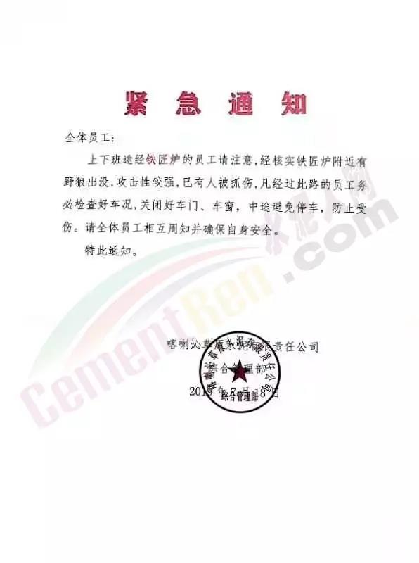 昨日(18日)喀喇沁草原水泥有限責任公司發(fā)布緊急通知給全體員工稱,上下班途經(jīng)鐵匠爐的員工需注意,經(jīng)核實鐵匠爐附近有野狼出沒,攻擊性較強,已有人被抓傷,凡經(jīng)過此路的員工務必檢查好車況,關閉好車門、車窗,中途避免停車,防止受傷。請全體員工相互周知并確保自身安全。