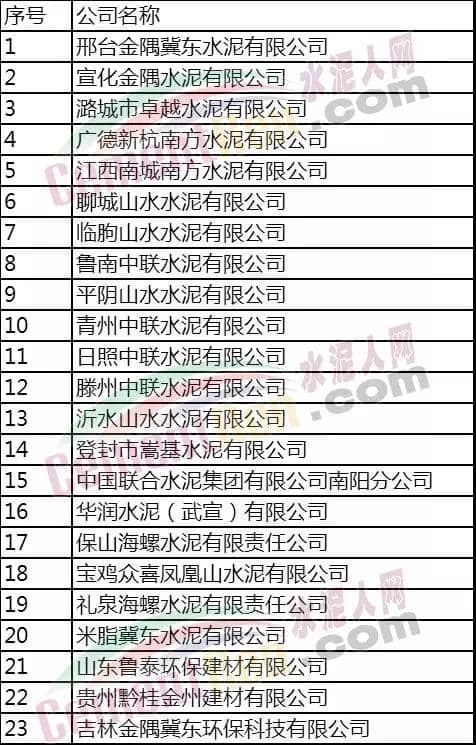 本次公布的綠色工廠名單當(dāng)中,包括邢臺(tái)金隅冀東水泥有限公司、廣德新杭南方水泥有限公司、聊城山水水泥有限公司、青州中聯(lián)水泥有限公司、保山海螺水泥有限責(zé)任公司、華潤(rùn)水泥(武宣)有限公司等23家水泥企業(yè),具體名單如下: