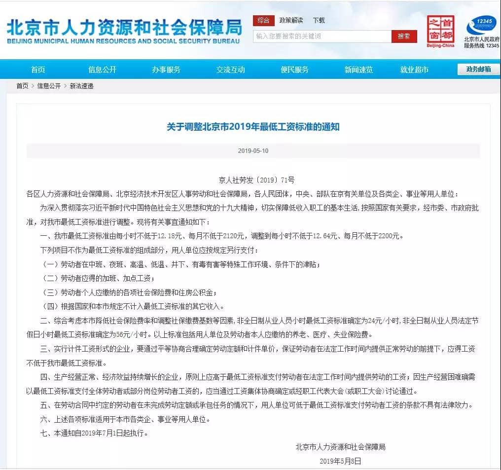 5月,北京市人力資源和社會保障局發(fā)布《關(guān)于調(diào)整北京市2019年最低工資標(biāo)準(zhǔn)的通知》。7月1日起,北京市最低工資標(biāo)準(zhǔn)由每小時(shí)不低于12.18元、每月不低于2120元,調(diào)整到每小時(shí)不低于12.64元、每月不低于2200元。
